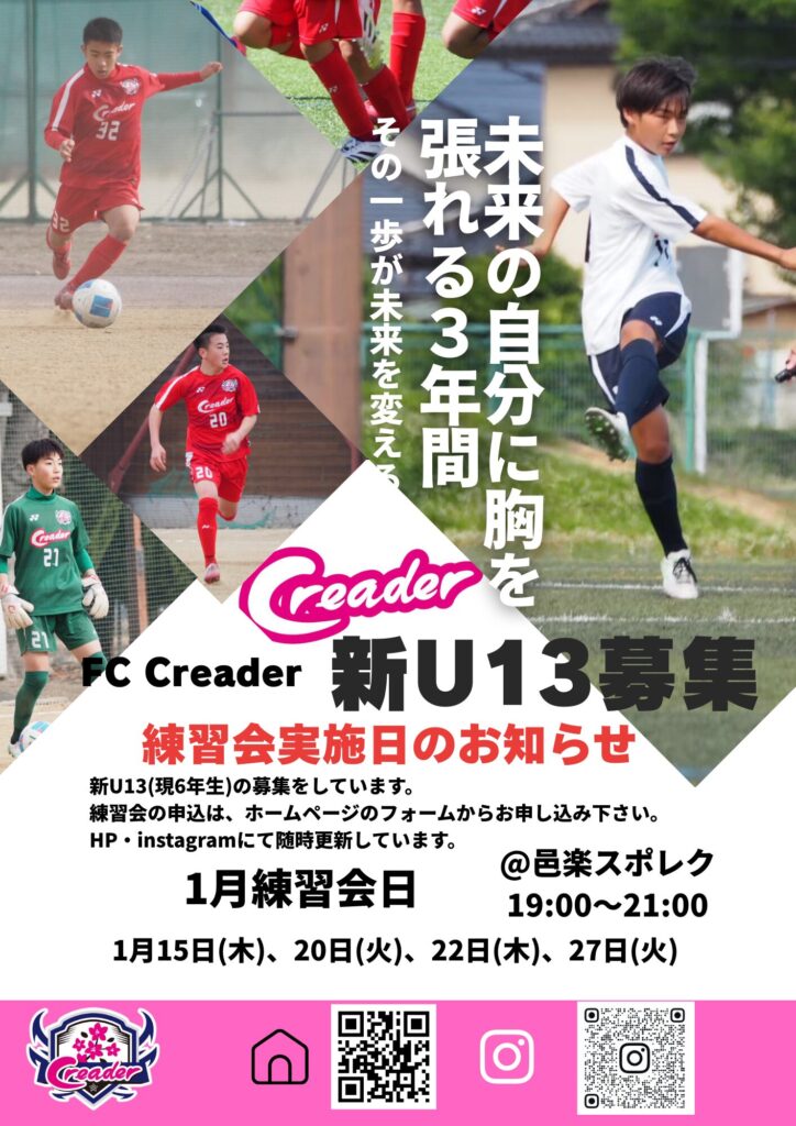 サッカーは上手い下手ではありません。情熱を強く持ち、サッカーと向き合え向上心がある選手を募集しています。そのような選手は是非クレアデールの門を叩いてください。プロ経験がある指導者、全国大会優勝経験がある指導者がみんなを待っています。
